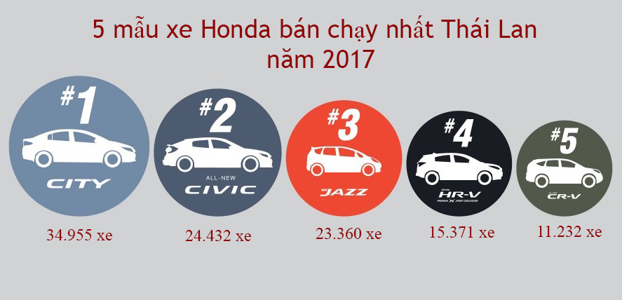 Honda Automobile vừa công bố doanh số năm 2017 tại Thái Lan. Về tổng quan, Honda duy trì vị trí thứ ba ở thị trường xe chung ở Thái Lan, sở hữu 14,7% thị phần, tăng 0,7% so với năm ngoái.
